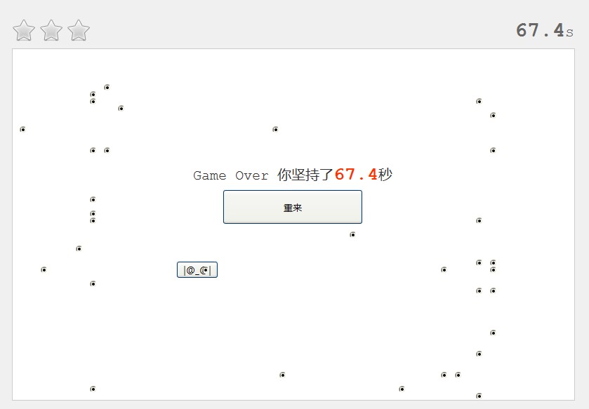 一直都觉得javascript可以玩得很cool。所以终于尝试了使用js来写了一个小游戏,界面上其实也没什么特色~~普普通通吧,paperen将这个游戏取名为(untouchable)不可触及,游戏规则其实很简单,不要让那个按钮与那些飞来飞去的小球发生碰撞,看你能熬到多少秒。