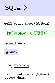 使用php代码就先送入call count_mycost(6,@num);后送入select @num;来获取数据。