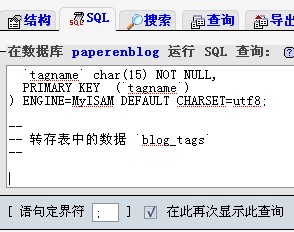 2.打开sql.txt,将sql语句导入到您的数据库中(即导入到paperenblog数据库中)