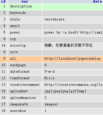 3.进入blog_config表主要修改一下url参数的数据,默认是http://paperen.com,请根据自己的需要修改(例如我现在是在本机测试的,而放到一个叫blog的文件夹中,故这改为http://localhost/blog,如果我是要放到自己的空间上那么就为http://您的域名)最后不需要加上/