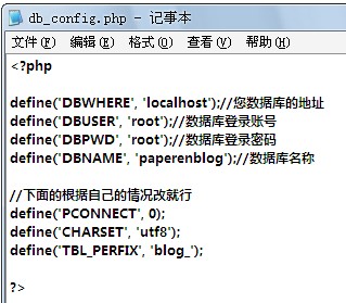 define('DBNAME', 'paperenblog');//数据库名称(如果您的数据库不是paperenblog的话就改为您刚才新建的那个数据库名称)