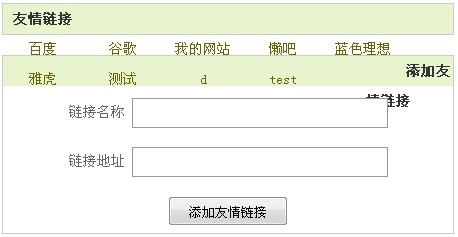 就这样前台显示友情链接的功能就over了,当然啦,还需要有添加友情链接的功能,还有修改友情链接的功能才行,而我就说到这里吧,添加与修改功能实现起来差不多,当然也有不少差别,改天有空再补上吧。