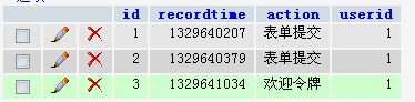 当然你需要为记录器提供数据表的支持,如果你不打算使用数据表记录的话可以自己更改userlogger中record中的记录保存方式,而paperen这个例子中使用的是一个叫userlog模型,对应着数据库中userlog这张表。当访问了http://localhost/codeigniter/index.php/form与http://localhost/codeigniter/index.php/welcome/token 时将触发自动记录用户行为的动作了,你还可以考虑在config中加入是否启动行为记录器的配置