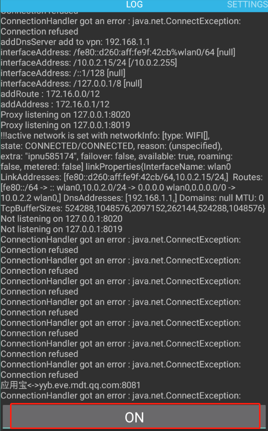 回到首页点击底部OFF就开启了,可以看到日志会刷新